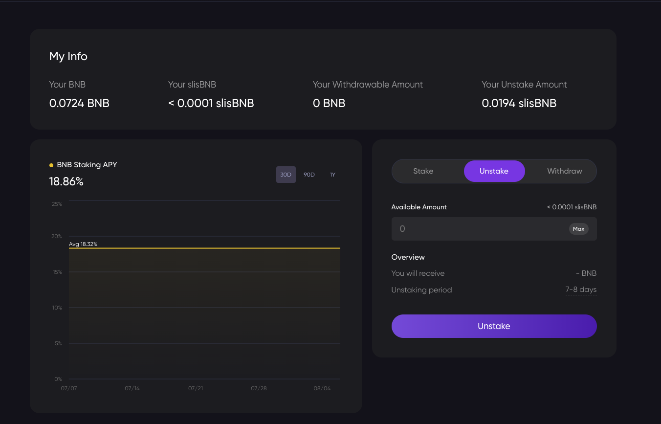 To unstake your BNB, return to the main page, and click on “unstake”
